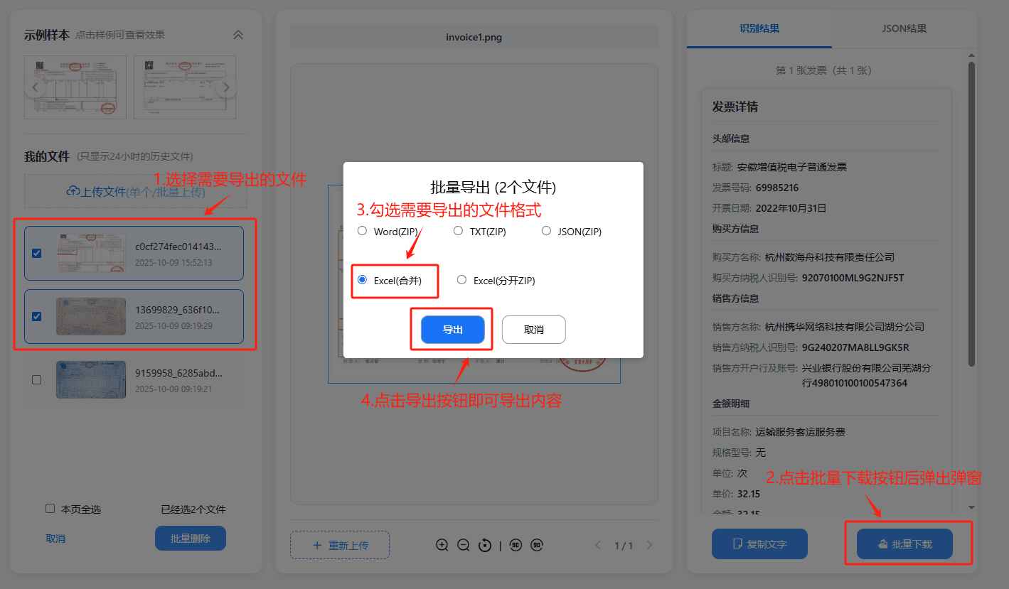 支持多发票上传和批量导出,效率远超人工录入(1小时处理500+张)